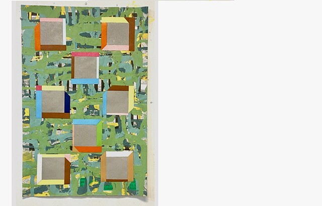 Garry Noland’s, Loot Box, paintings and photographic collages leave the viewer betwixt and between. He shapeshifts from one process to another and even includes his great-grandmother’s rugs in his installation. Is there a personal message from the artist in this cacophony of materials and color? Is there a thread that courses through the diversity and progression of his artwork?
